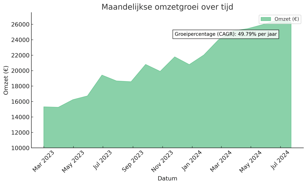 Van februari 2023 tot juli 2024 steeg de maandelijkse omzet van €15.000 naar ruim €27.500.